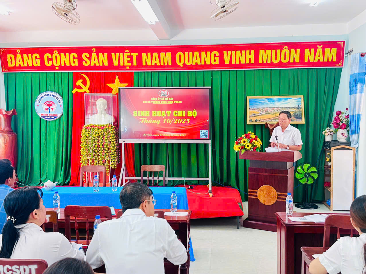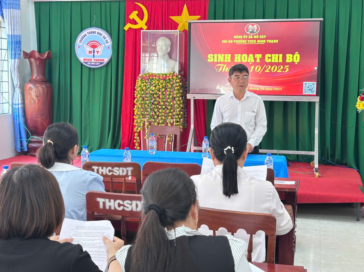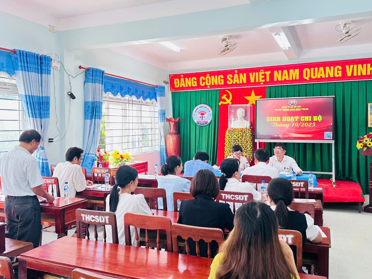 Thực hiện Điều lệ Đảng Cộng sản Việt Nam và chương trình công tác năm 2025, sáng ngày 3 tháng 10 năm 2025, Chi bộ Trường THCS Minh Thạnh đã tổ chức sinh hoạt Chi bộ định kỳ tháng 10 dưới sự chủ trì của đồng chí Nguyễn Công Huy Hiệp – Bí thư Chi bộ.