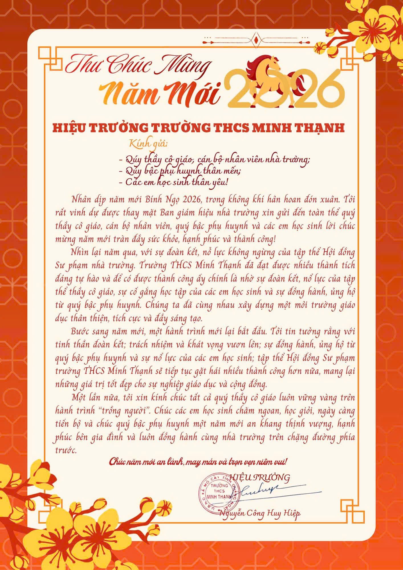 Nhân dịp năm mới – xuân Bính Ngọ 2026, thầy giáo Nguyễn Công Huy Hiệp-Bí thư Chi bộ, Hiệu trưởng trường THCS Minh Thạnh gửi thư chúc mừng đến cán bộ, giáo viên, nhân viên nhà trường, quý bậc cha mẹ học sinh cùng các em học sinh. Xin giới thiệu toàn văn thư chúc mừng năm mới: