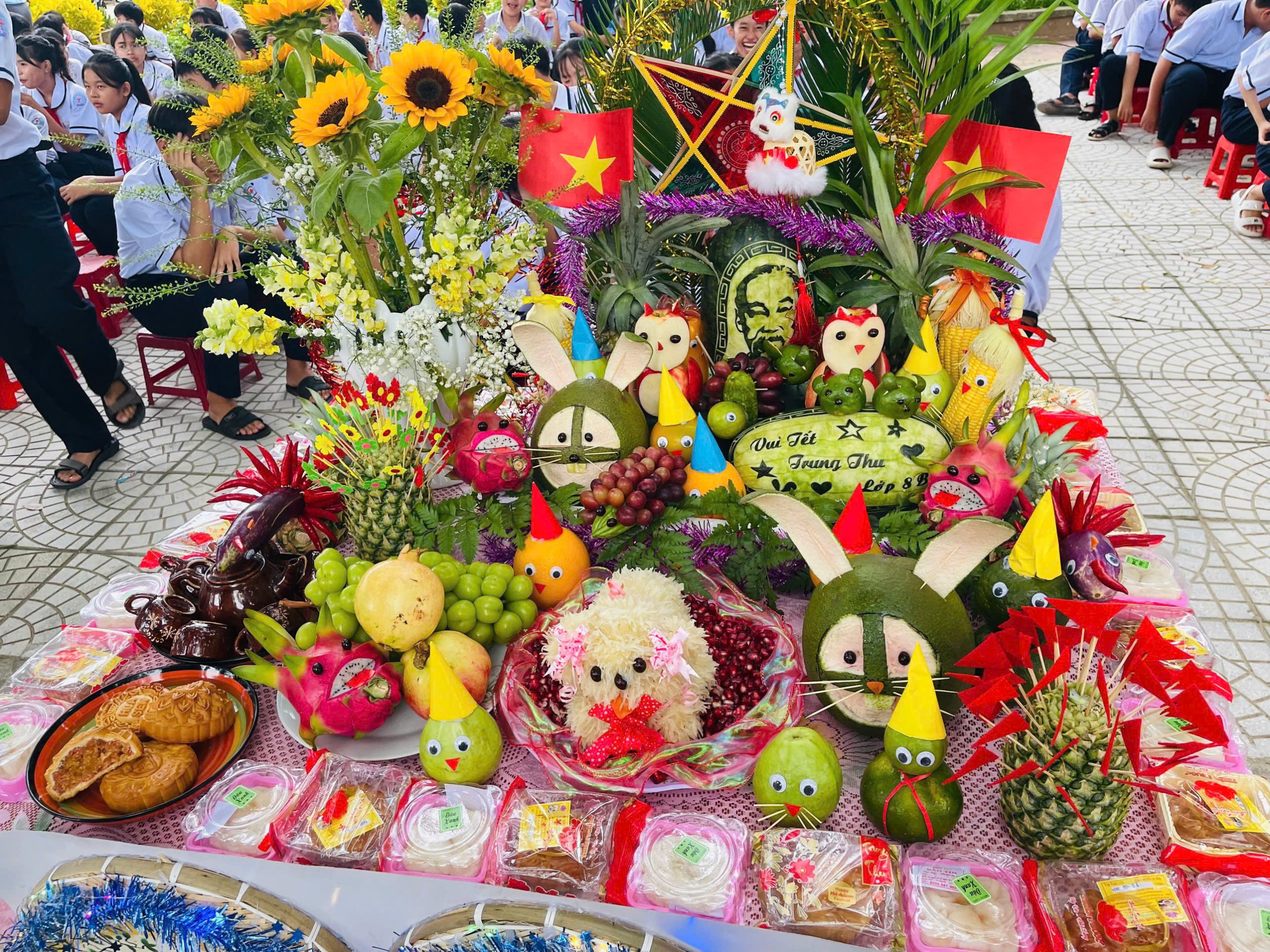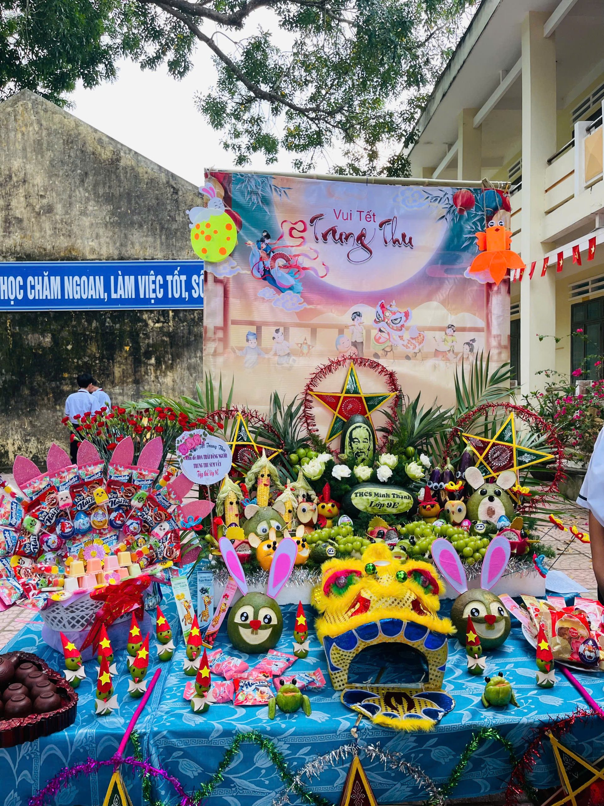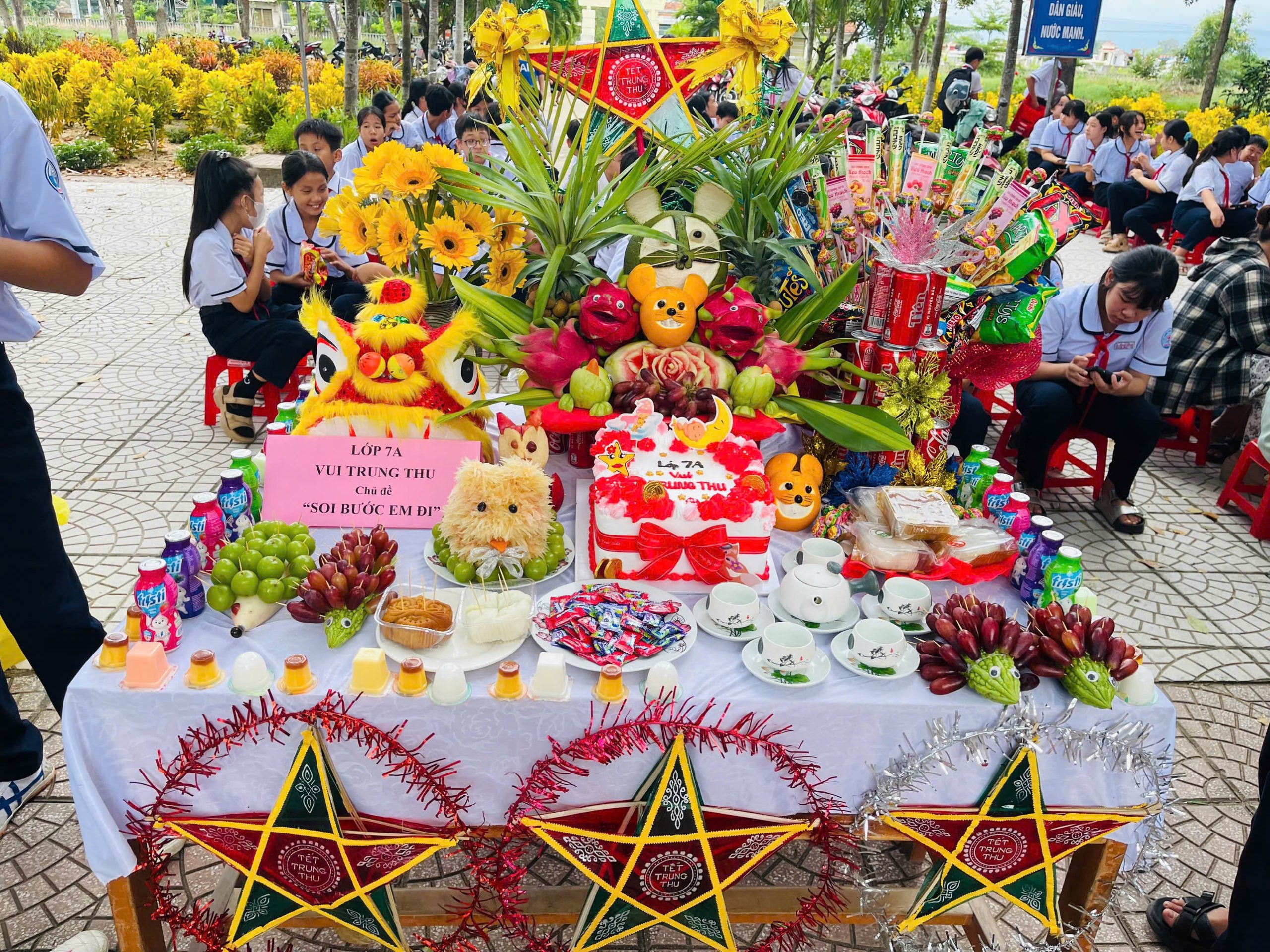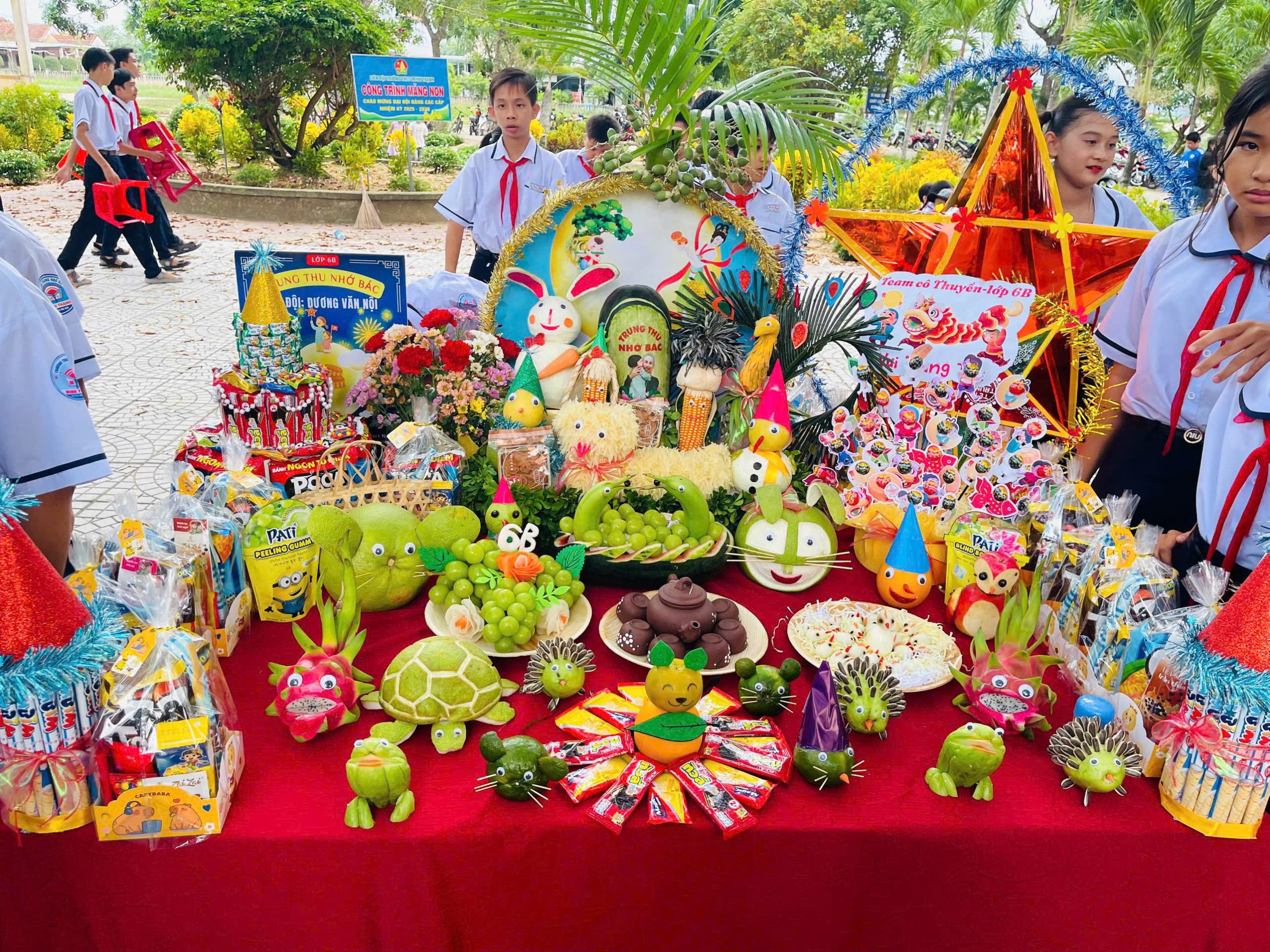Bên cạnh đó, phần thi trình bày và thuyết trình mâm cỗ Trung thu cũng để lại nhiều dấu ấn. Các lớp đã chuẩn bị những mâm cỗ xinh xắn, đầy đủ hương vị truyền thống: bánh nướng, bánh dẻo, trái cây ngũ quả, đèn ông sao, đầu lân… Không chỉ bày biện đẹp mắt, các em còn thể hiện khả năng thuyết trình tự tin, lưu loát, nêu bật ý nghĩa của từng loại quả, từng món bánh – biểu trưng cho hạnh phúc, đoàn viên, và ước vọng một năm học mới nhiều thành công.