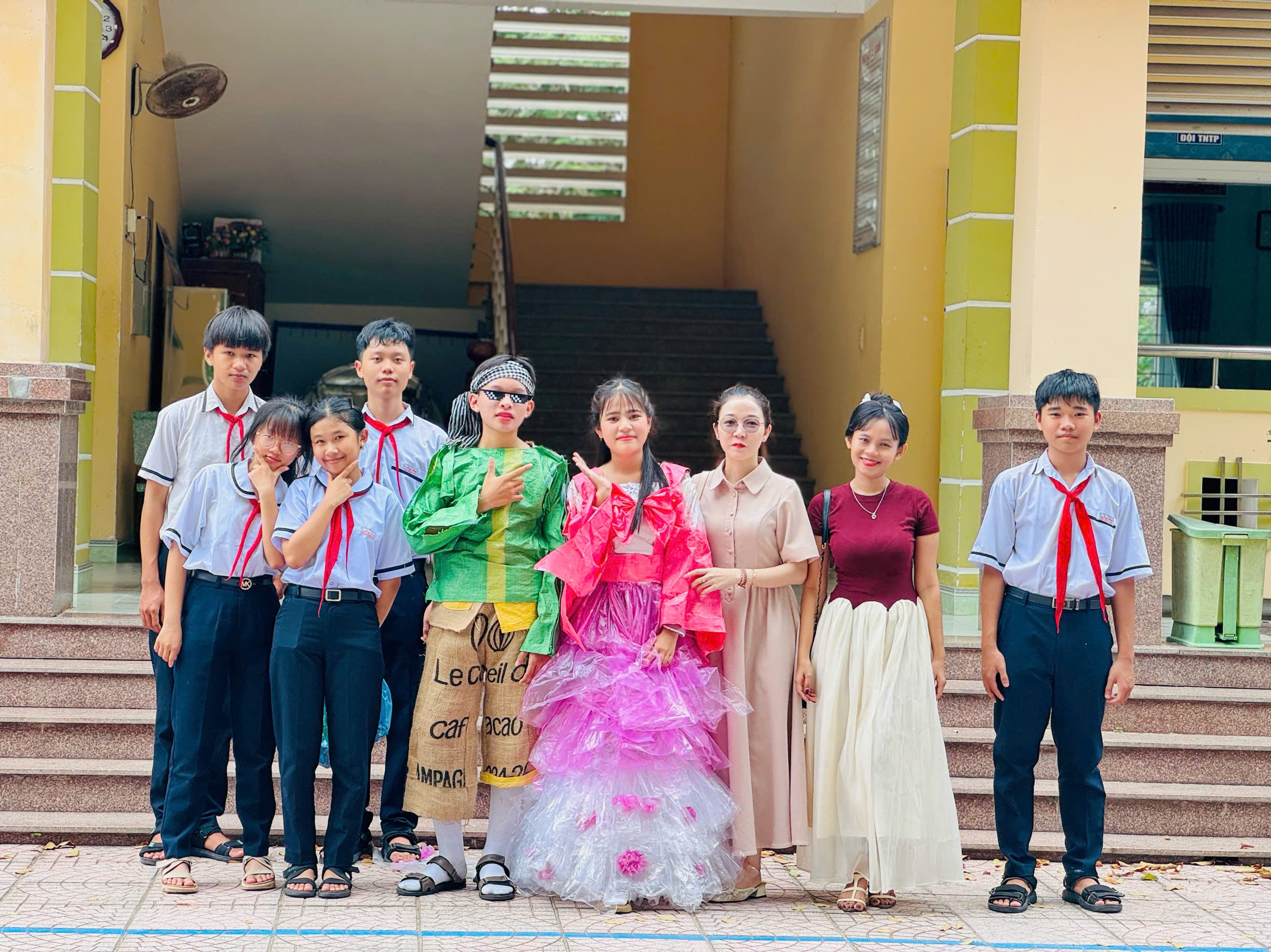 Tiếp nối chương trình, các em học sinh còn được tham gia vào phần thi trình diễn trang phục tái chế “Chị Hằng – Chú Cuội”. Từ những vật liệu đơn giản như giấy báo, áo mưa, túi nilon…, qua bàn tay khéo léo và óc sáng tạo, các lớp đã biến chúng thành những bộ trang phục rực rỡ, ấn tượng. Mỗi điệu múa của “Chị Hằng”, mỗi nụ cười tinh nghịch của “Chú Cuội” đều mang thông điệp sâu sắc về bảo vệ môi trường – tái chế để xanh hơn.