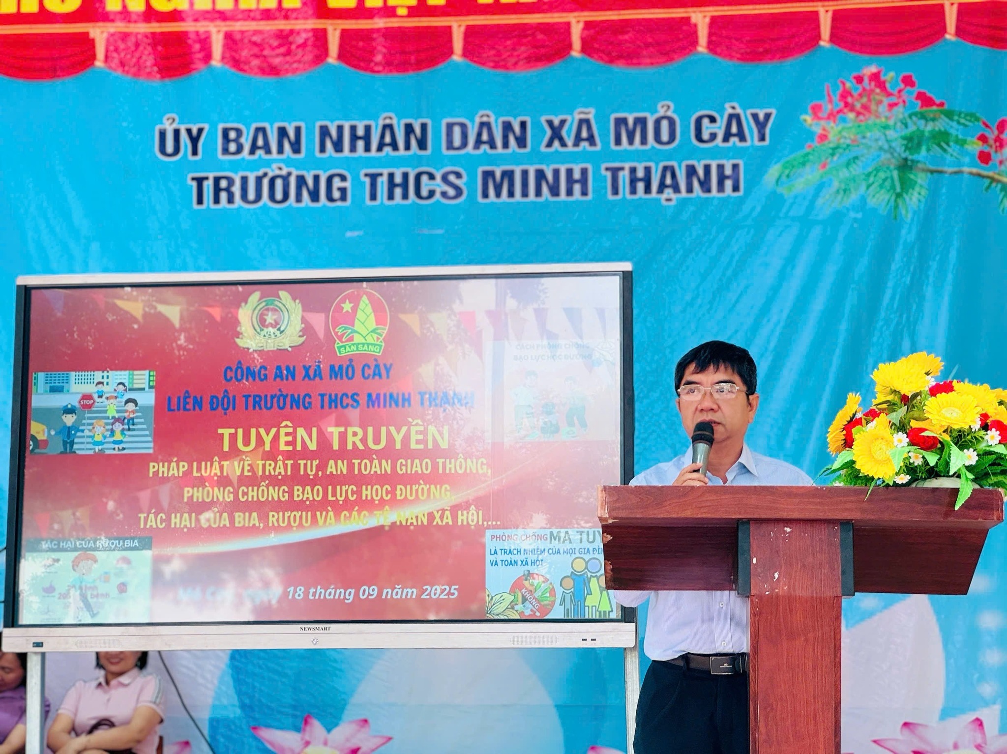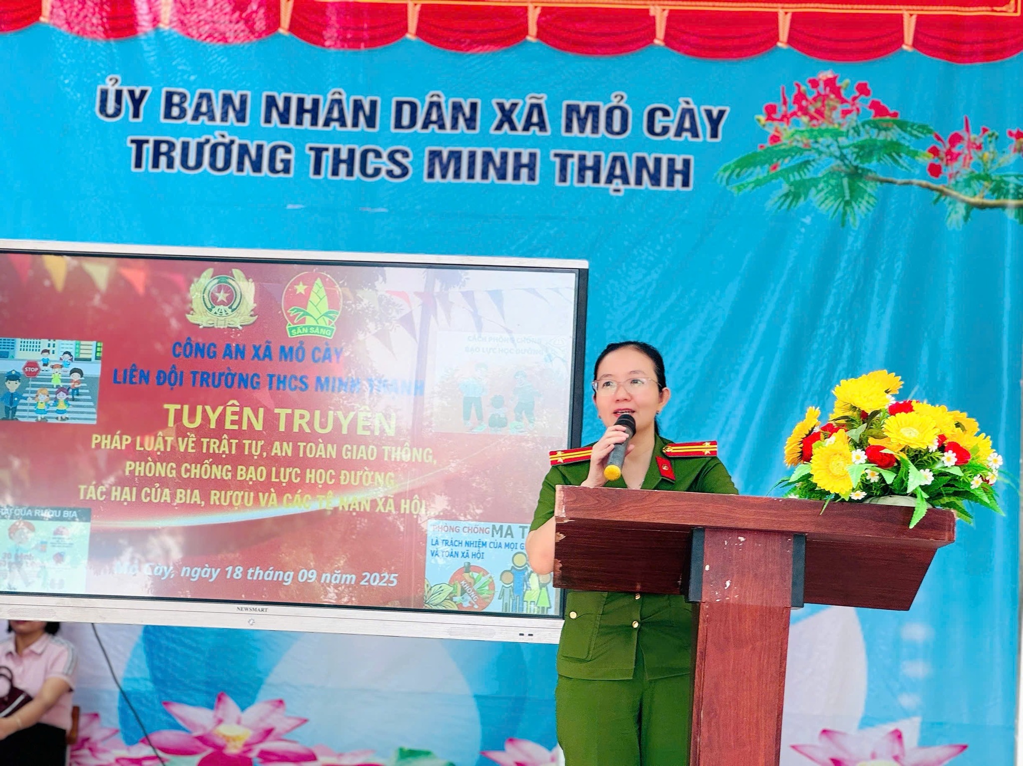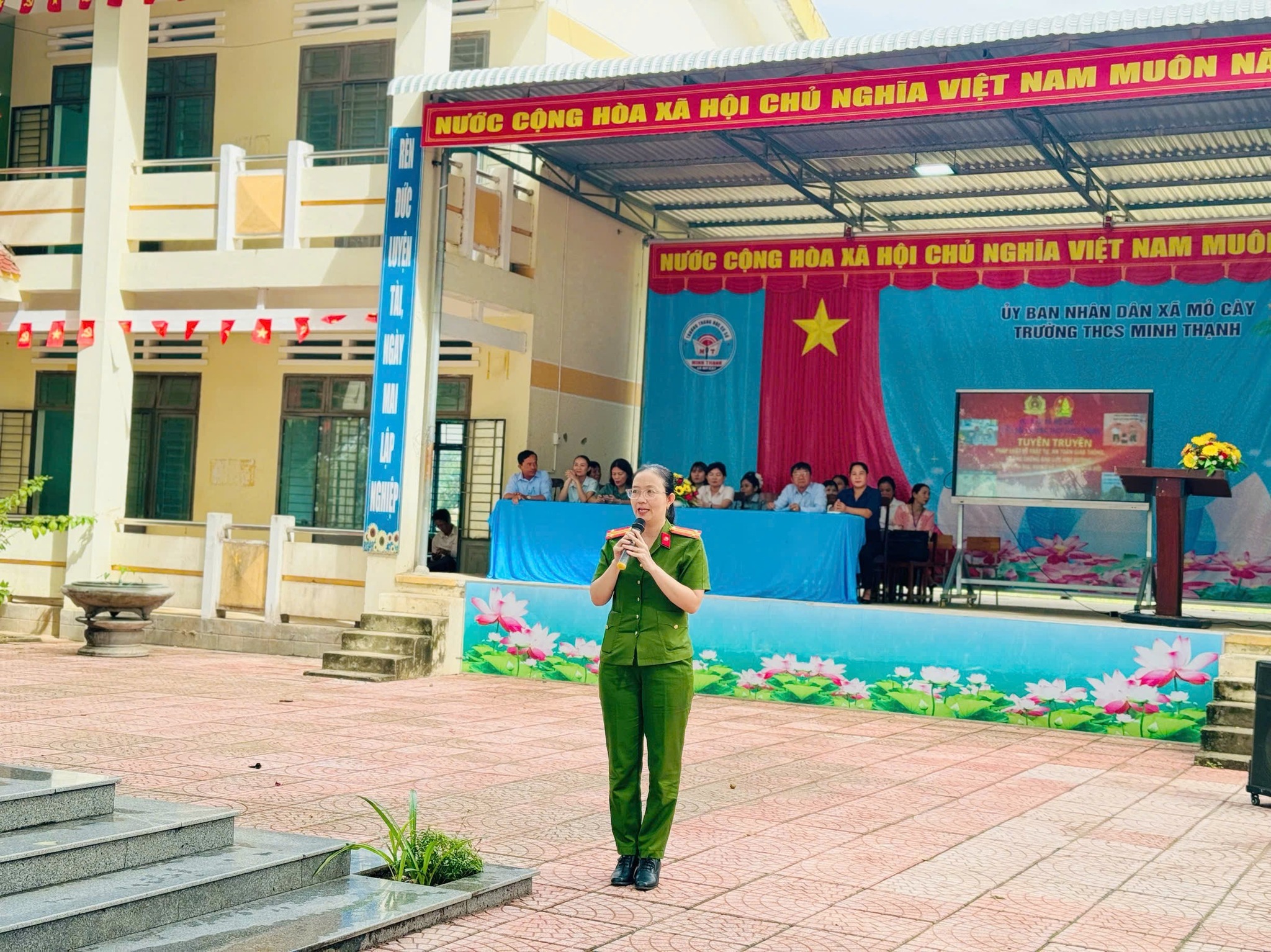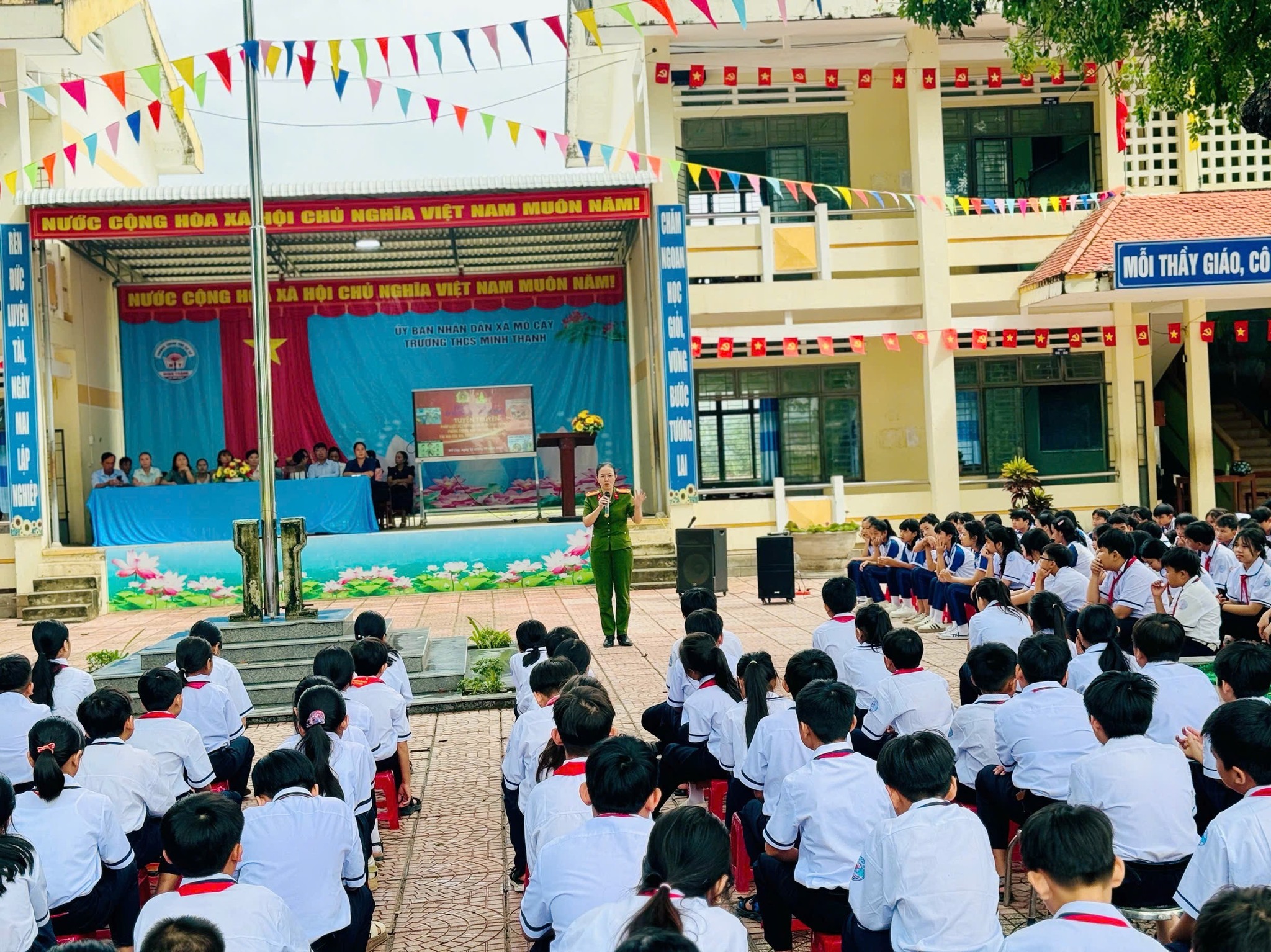 Đến dự buổi tuyên truyền có đồng chí Nguyễn Thị Nhật Loan – Phó Trưởng Công an xã Mỏ Cày làm báo cáo viên, Lãnh đạo nhà trường, cùng toàn thể viên chức và học sinh Trường THCS Minh Thạnh.